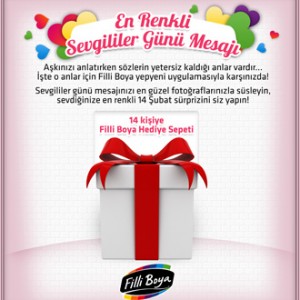 Aşkınızı anlatırken sözlerin yetersiz kaldığı anlar vardır. İşte o anlar için Filli Boya yepyeni bir Facebook kampanyasıyla karşınızda. Filli Boya’nın Facebook’taki takipçileri Sevgililer Günü’nü bu yıl farklı bir heyecanla kutluyor. 7 Şubat’ta başlayıp 15 Şubat’a kadar sürecek olan “En Renkli Sevgililer Günü Mesajı” kampanyasıyla Filli Boya, kullanıcıların dilediği mesaj ve görsellerle kolaj yapıp paylaşabileceği bir interaktif uygulama sunuyor.