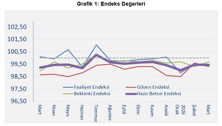 Hazır Beton Endeksi 2026 Mart Ayı Raporu’na göre tüm endeksler 2025 yılının büyük bölümünde eşik değerin altında dalgalı bir seyir izledikten sonra yılın son çeyreğinde sınırlı bir toparlanma eğilimi göstermiş, ancak 2026 ocak ayında bu eğilim yerini zayıflamaya bırakmıştır. Şubat ayındaki toparlanmanın ardından mart ayı itibarıyla endekslerde farklılaşan bir seyir gözlenmektedir.
