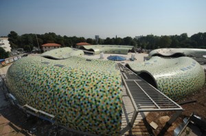 gerçekleştirmekte etkili oldu. Sonrasında ise hem düşey hem de yatayda dairesel formda devam eden çatı kabuğunun kaplamasının rengârenk olmasının yanı sıra, projede ısı, ses ve su yalıtımına imkân veren altıgen (futbol topu yüzeyi) porselen seramik kullanılmasına karar verildi. Bu fikir, Kalebodur markasının sadece bu projeye özel, bizim yaptıklarımızı destekleyen yeni bir yatırım yapmasıyla gerçekleşti. Tasarım sürecinde ilk olarak 28 renk tonu seçtik ve Kalebodur ile ilk numune çalışmalarını tamamladık. Sonrasında bu sayıyı düşürerek uygulamaya geçtik.”