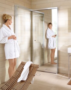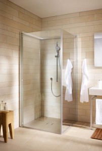 Parlak krom görünümündeki bir çerçeve “OpenSpace” duş kabininin duvardaki hatlarını belirliyor. Bu çerçeveye iki büyük cam kapı