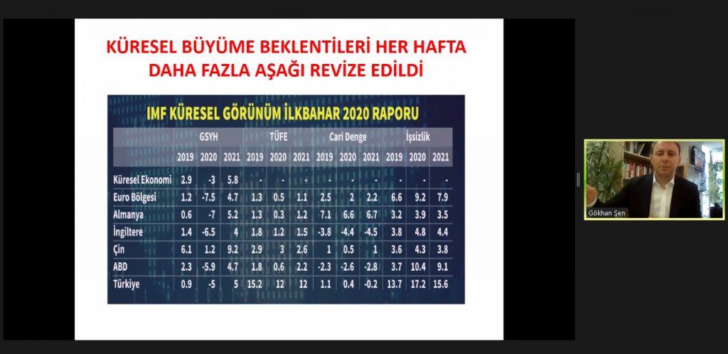 Küresel salgının dünya ve Türkiye ekonomisine etkisini anlatan Gökhan Şen, ülke olarak yeni ekonomiye hazırlanmak gerektiğini belirterek, “Eskiden olduğu kadar iç talebin canlı olmayacağını bilmek lazım. İkinci önemli unsur tabii ihracat. İhracatın önceleneceği bir ekonomiye hazırlanmak gerekiyor. Dünyada artık her ülke ihracatı canlandırmaya çalışıyor. Çünkü başka çıkış yolu kalmadı. O yüzden bu yeni ekonomiye hazırlanmak lazım. Şu an Serbest Ticaret Anlaşması olmayan ve Avrupa Birliği dışındaki ülkelere uygulanan yüksek yeni gümrük tarifeleri bence önümüzdeki döneme ilişkin bir hazırlığın ön gösterimi oluyor” diye konuştu.