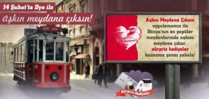 Dyo, 14 Şubat Sevgililer Günü için başlattığı Facebook uygulaması ile sevginizi dile getirme ve sürpriz hediyeler kazanma şansı sunuyor. 28 Şubat 2013 tarihine kadar devam edecek olan Aşkın Meydana Çıksın uygulamasında, katılımcılar sevdiklerine kalplerinden dökülen cümleleri, dünyanın en güzel meydanlarında dile getirme imkânı buluyor.
