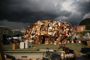 Almanya Darmstadt’daki tiyatro binası ‘The Big Crunch’; sandalye, buzdolabı gibi ev eşyalarının kırık ve eski parçalarından inşa edildi. Tümü geri dönüştürülebilen parçalar, yapının çelik iskeletinin üzerine yerleştirildi.