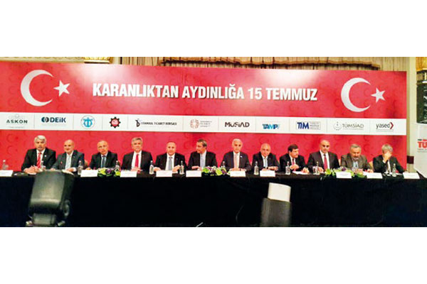 İş dünyasının önemli temsilcilerinden, İstanbul Ticaret Odası (İTO), Anadolu Aslanları İşadamları Derneği (ASKON), Dış Ekonomik İlişkiler Kurulu (DEİK), Deniz Ticaret Odası (DTO), İstanbul Sanayi Odası (İSO), İstanbul Ticaret Borsası (İSTİB), Müstakil Sanayici ve İşadamları Derneği (MÜSİAD), Alışveriş Merkezleri ve Perakendeciler Derneği (TAMPF), Türkiye İhracatçılar Meclisi (TİM), Tüm Sanayici ve İş Adamları Derneği (TÜMSİ- AD), Türkiye Seyahat Acentaları Birliği (TÜRSAB) ve Uluslararası Yatırımcılar Derneği (YASED) Başkanları İstanbul’da bir araya gelerek darbe girişimini kınadı. Demokrasinin Kazandığı Bir Gün ‘Karanlıktan Aydınlığa 15 Temmuz’ ortak bildirisine imza atan kuruluş ve STK’lar adına MÜSİAD Başkanı Nail Olpak okudu. Olpak’ın okuduğu ortak metinde şu ifadeler yer aldı: “Ülkemiz, 15 Temmuz Cuma gecesi önce karanlığı, ortaya konan büyük inanç ile de aydınlığı yaşadı. Artık 15 Temmuz, öznesi millet olan demokrasinin kazandığı bir gündür.